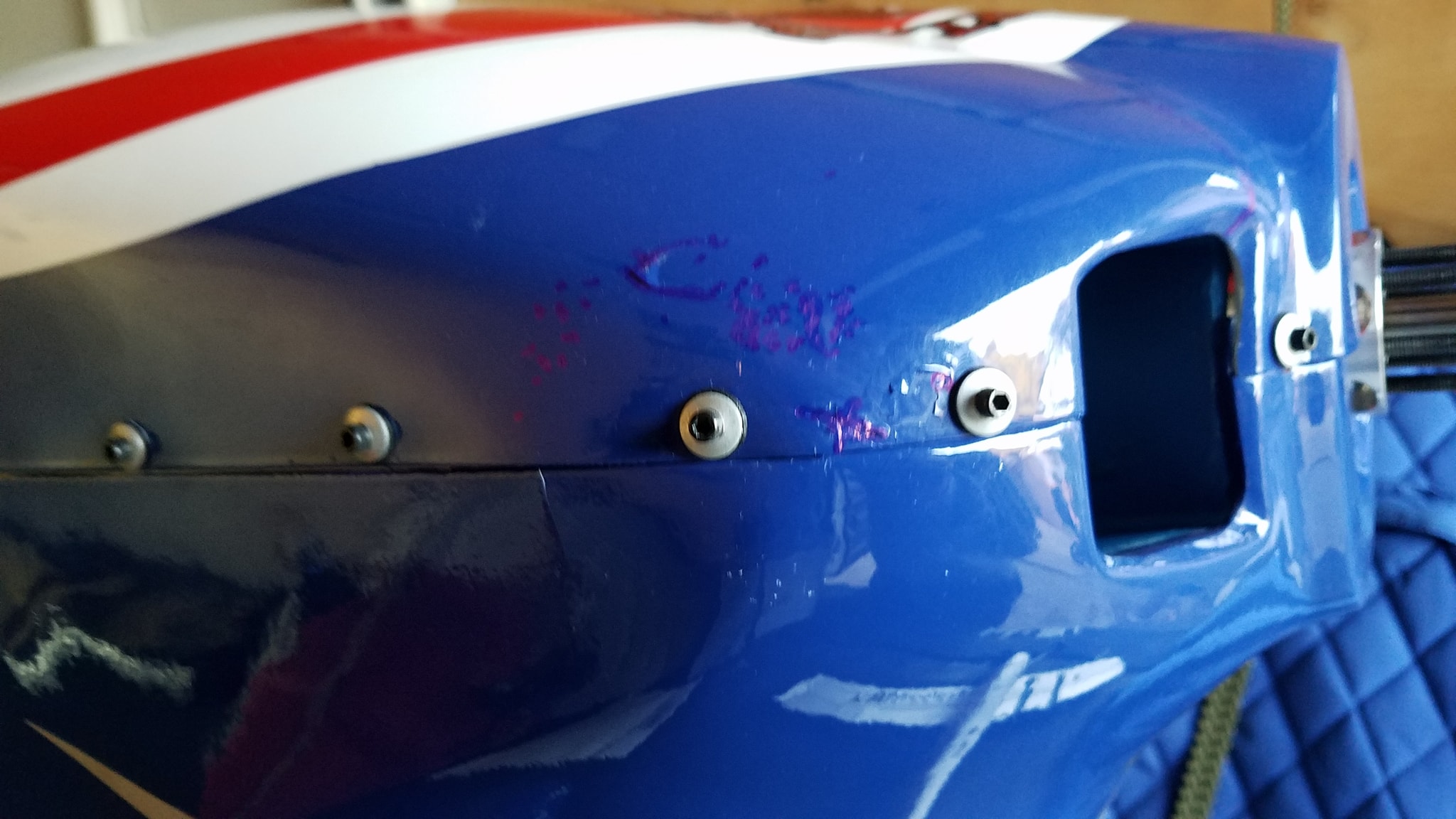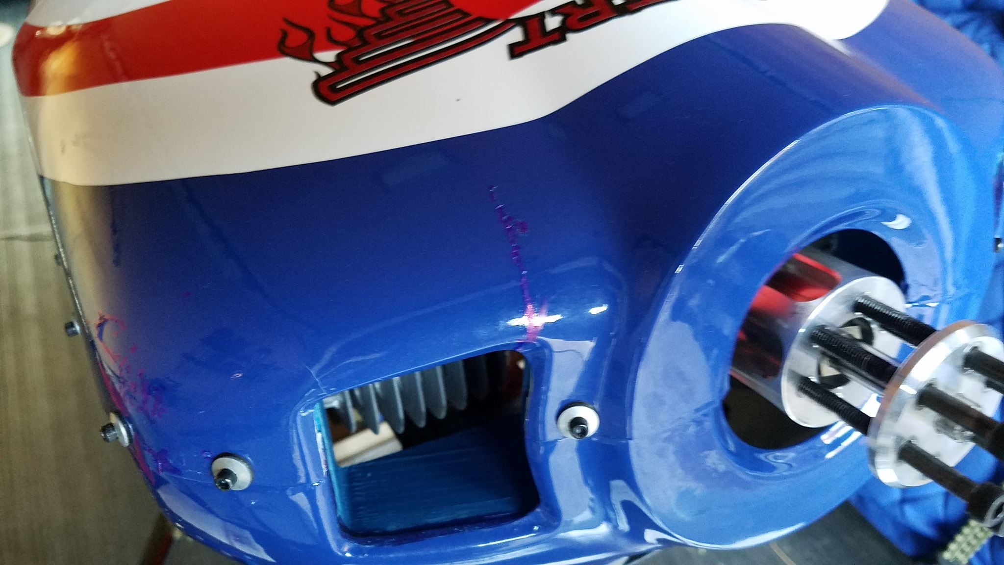 You are pissed off it those kind of accidents that just drive me nuts all done and one second later and you more work and cost thane started with. It’s when you knock your plane off the workbench it is painful.Went to replace the 2 canopy pins in my AJ Laser yesterday since they fell out. Was about ready to start wrapping it up when suddenly a gust of wind came up and knocked the airplane off my workbench. A broken propeller, a busted spinner and bent backplate (only 2 weeks old!!), a cracked cowl, and a huge ding in the turtle deck