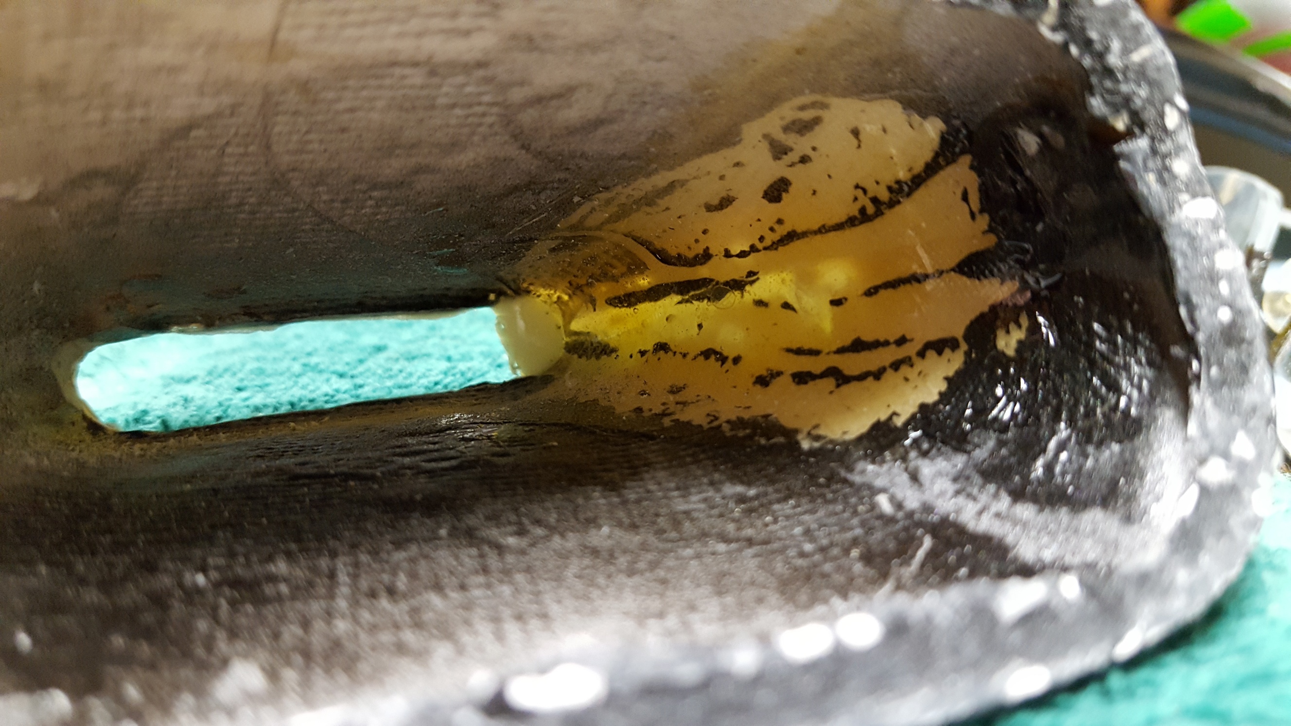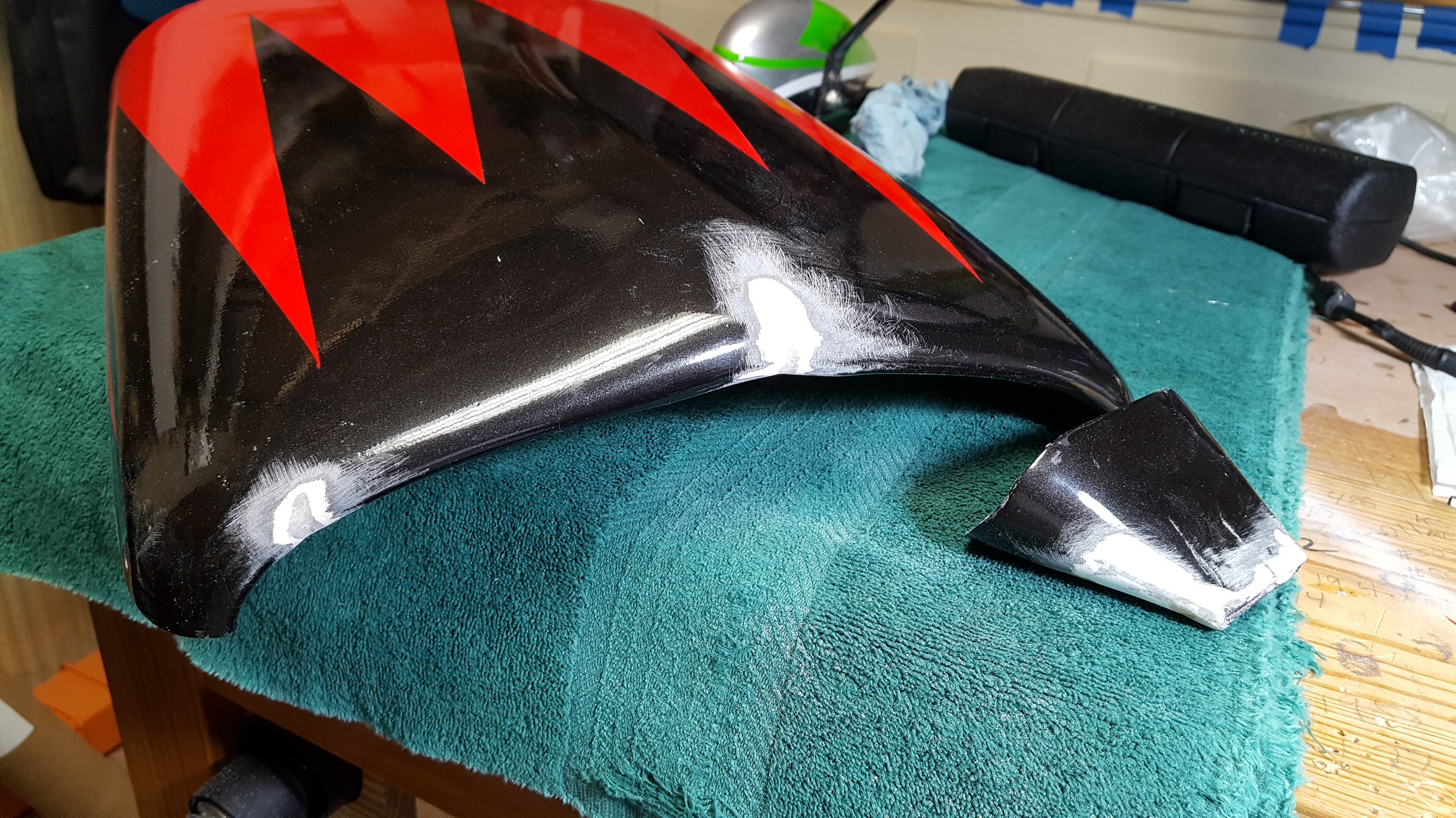 I've been doing some repair work on the cowl and cuff for my 35% Extra 300. I started by aligning all the cracks and using some thick CA and accelerator to glue them together. After that I used some glass cloth and resin to reinforce the back side of all the cracks. All I had was 1.5 ounce cloth, so there are several layers on each spot. I let the resin cure overnight, then trimmed off all the excess and then took a sanding drum to the outside of each crack to V it out a bit, followed by hand sanding them with some 150 to smooth it all out. I mixed some 30 minute epoxy with milled fiberglass to make a filler and filled everything. It's not the easiest sanding stuff in the world, but it's strong, doesn't get brittle, and it works great. I let that harden overnight and blocked it with 80 grit and then 150.