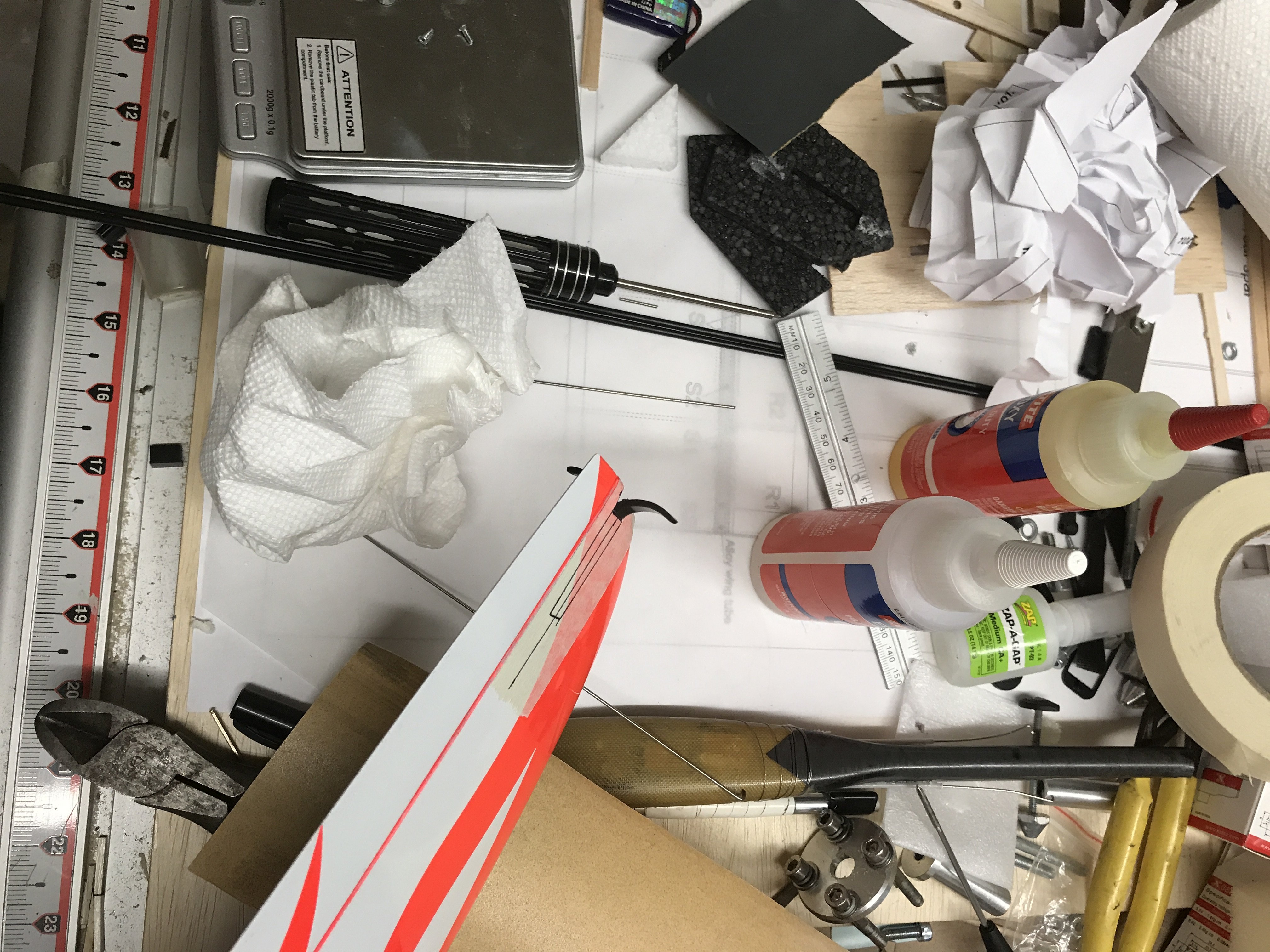 Someone once told me, "A clean desk", (my HP days) is a sign of a sick mind. Now days, I can't even find my table. I know it is down there somewhere. Lurking beneath the layers of tools, parts, containers, irons, more tools, more parts...more containers....A friend of mine that used to race Quickies told me one day that he knew it was time to clean the workbench when he had to set the airplane on a coffee can just to work on it.![]()