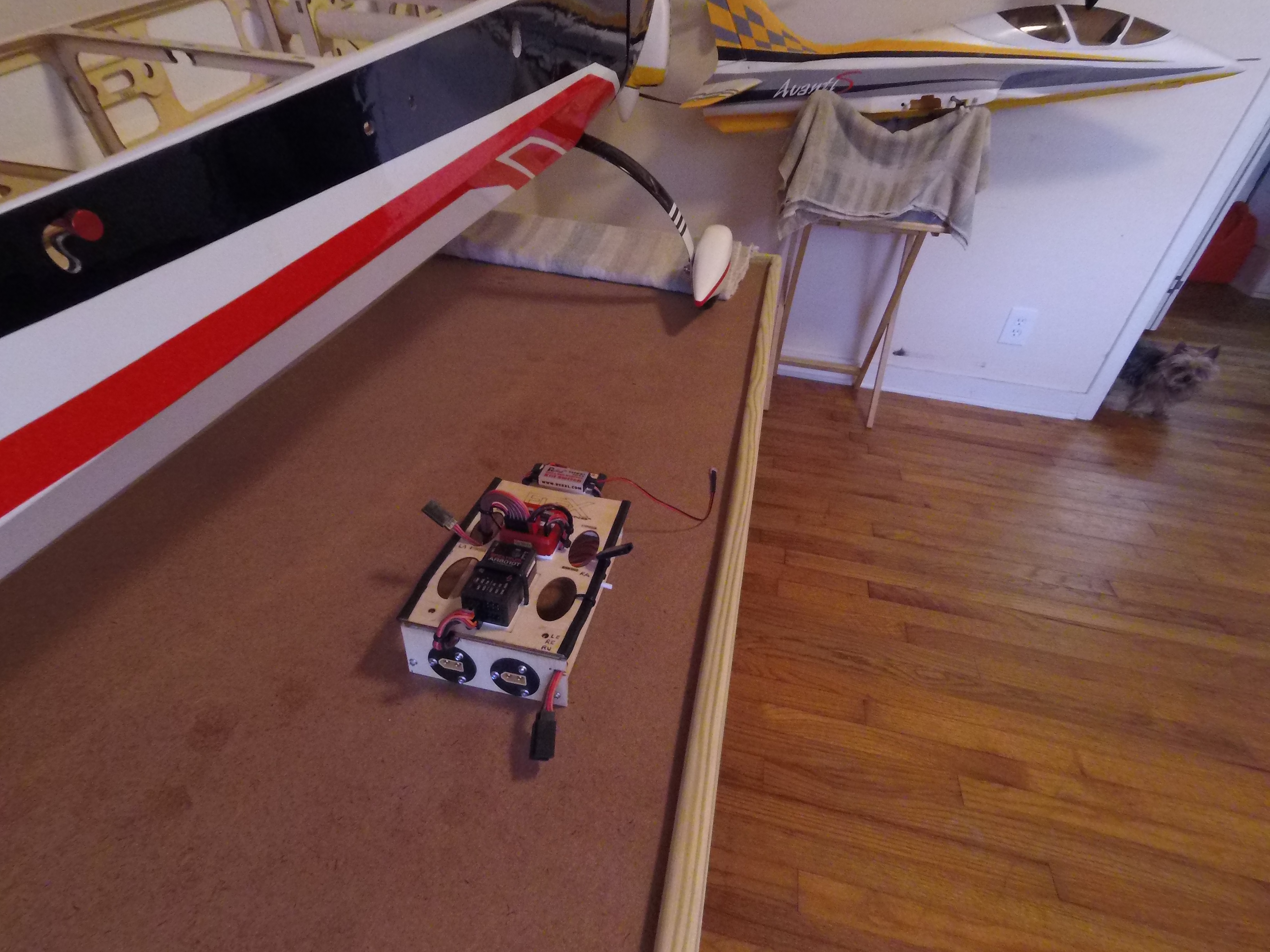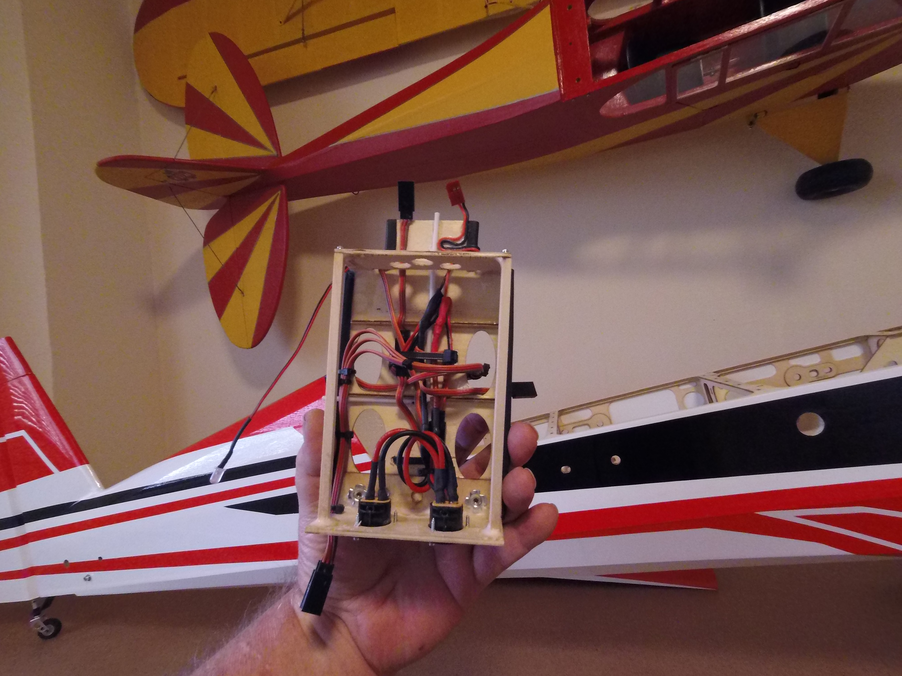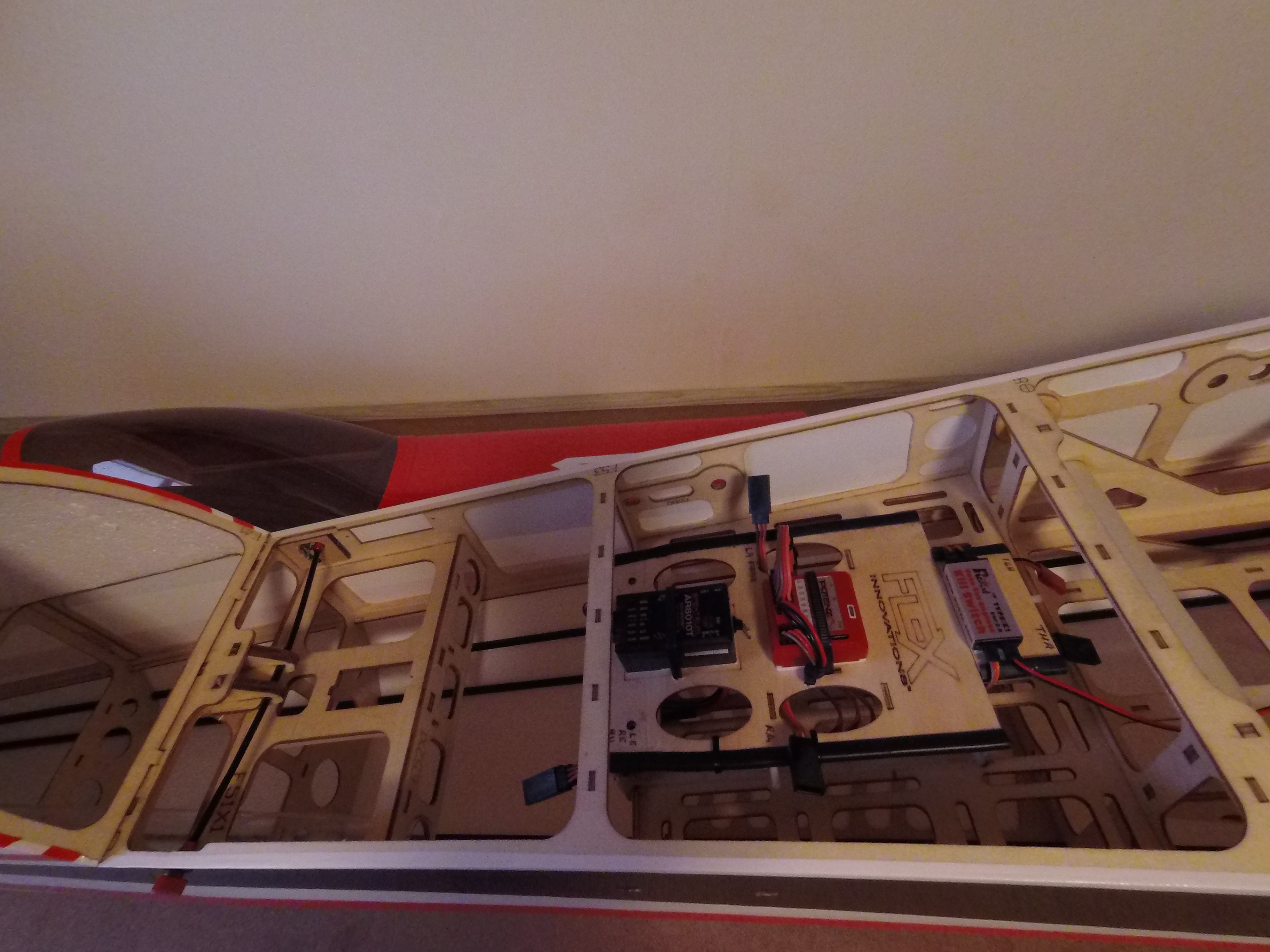 I made a removeable flight control board and "bused" power to "everything". Two 2S 2000mah Lipo's will get mounted under the rudder servo tray (One to the left of and one to right of rudder servo). All servos and ignition power simply plug in to it. To power up for a flight simply plug in the two batteries. When finished with a flight release the canopy and unplug the batteries. Like an "electric" :D.