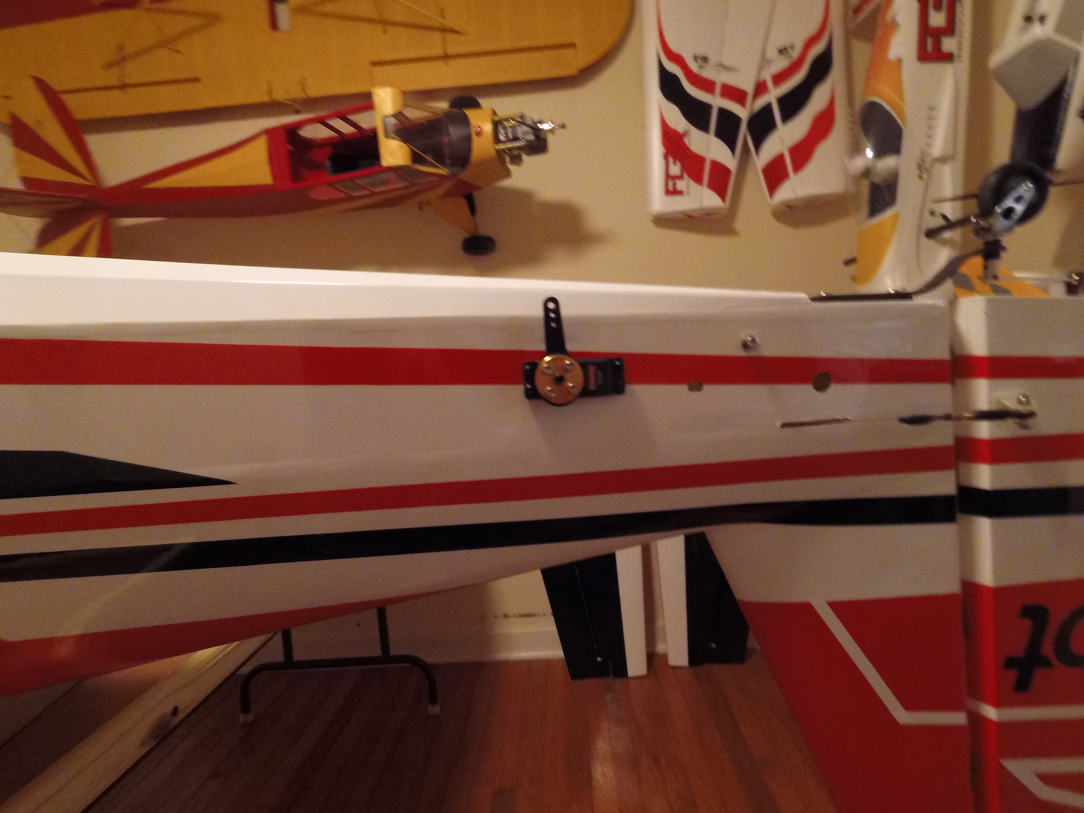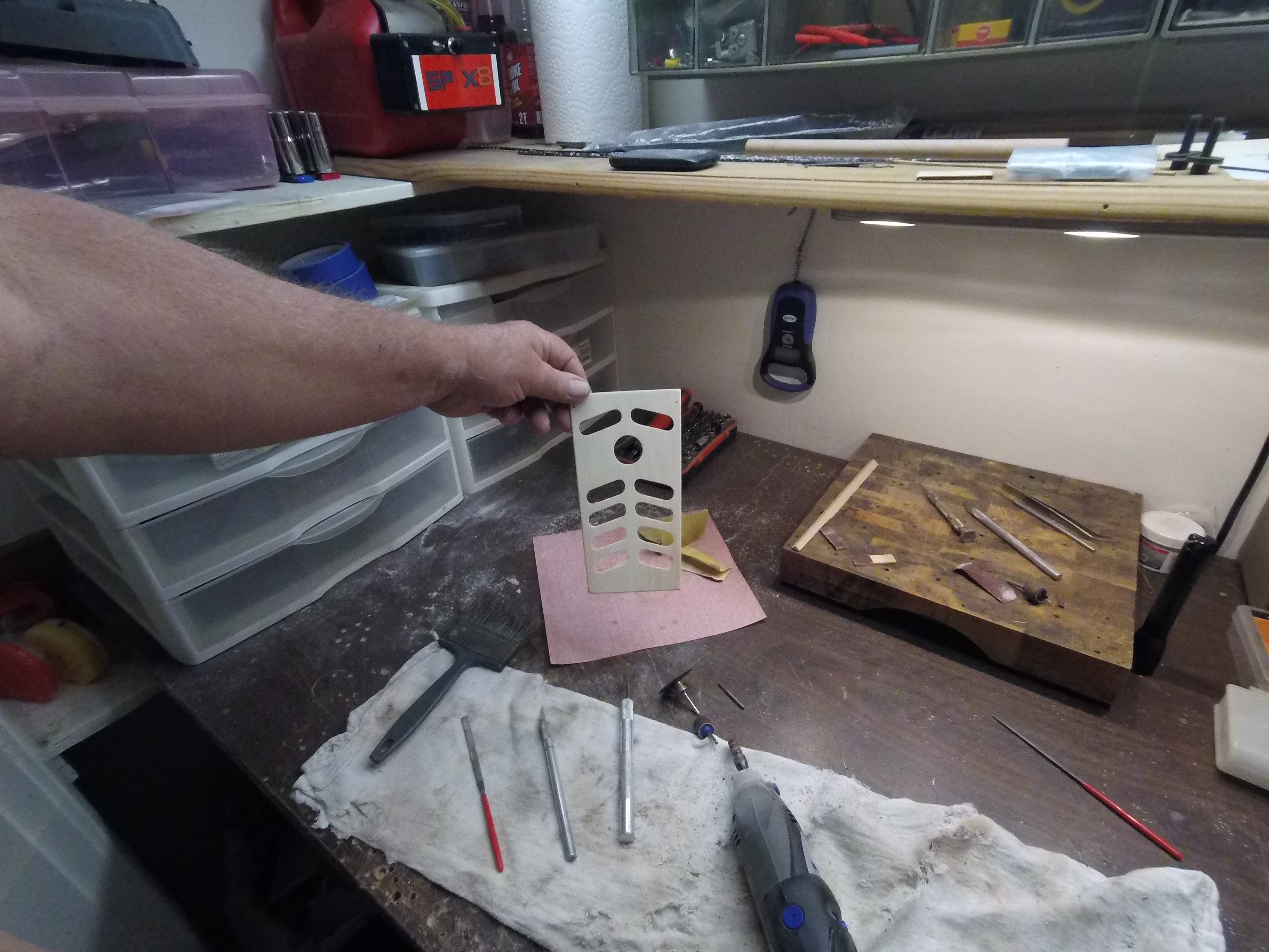 Was quite a chore but I did get the belly access panel done. Being I did it all by hand and sanded the edges of the openings I am going to prime and paint instead of covering it. I also made some servo arms from old mild steel arms, that came from a cheap ARF, by adapting aluminum servo wheels to them. The hangar 9 arms I had are 25T spline and Spektrum servos are 23T spline. My old arthritic fingers are not laser sharp ya know :errrr:.