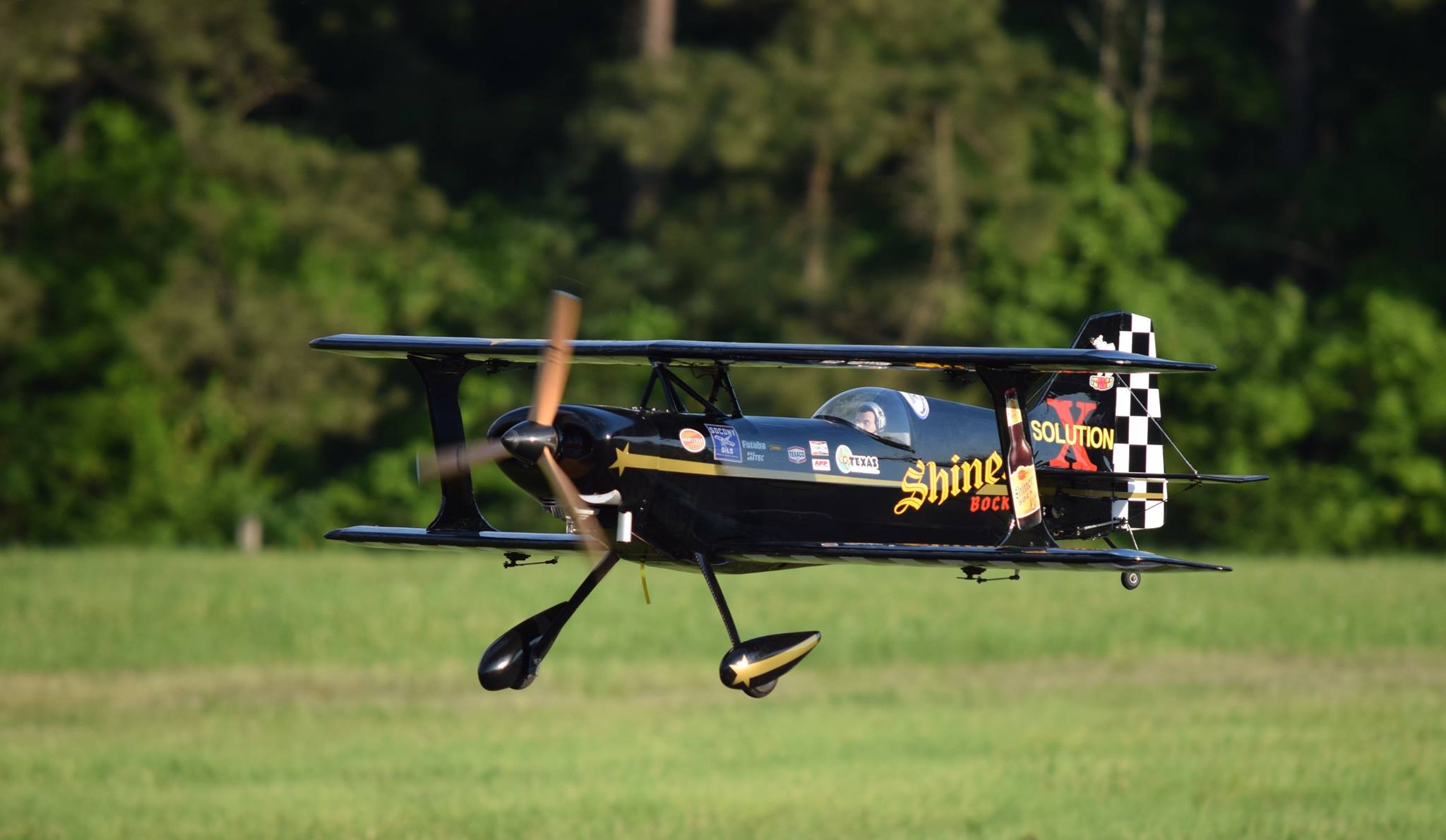 A little late, but here is my Solution X. I attempted to partially copy the Kermit Weeks black version with decals down the fuse from front to canopy, but also wanted to advertise for my favorite adult beverage, Shiner Bock. Bottom of wings (top, bottom and tail) are all black/white 2" checkerboard as it the rudder. Rest of the plane is black except the decals. Solution X on the tail, Shiner Bock on the top wing and either side of the fuselage. Powered by a DJ85cc on lunger from Mile High Hobbies, so far has proven to be an excellent choice. Running a 3 blade prop, I just like the looks!!!! Kit built many years ago, got it from a guy in San Antonio who got it at a swap meet. Looked like it had been flown, but not much, no damage ever. Great flying plane, looks really good. Wheel pants have clamp on mounts and so far they have not proven to be very good at staying tight enough to keep the pants in line, thus you get what I got in the picture....droopy wheel pants!!!!! Running all Savox servos from Ibcinyou-RC. Futaba radio gear, 14 channel receiver. This one is gonna be a keeper, a really good flying, stable bipe, no bad tendencies. Almost wish now I had opted for the 92 inch version instead of the 77 inch one. It could be in my future!!!View attachment 83530