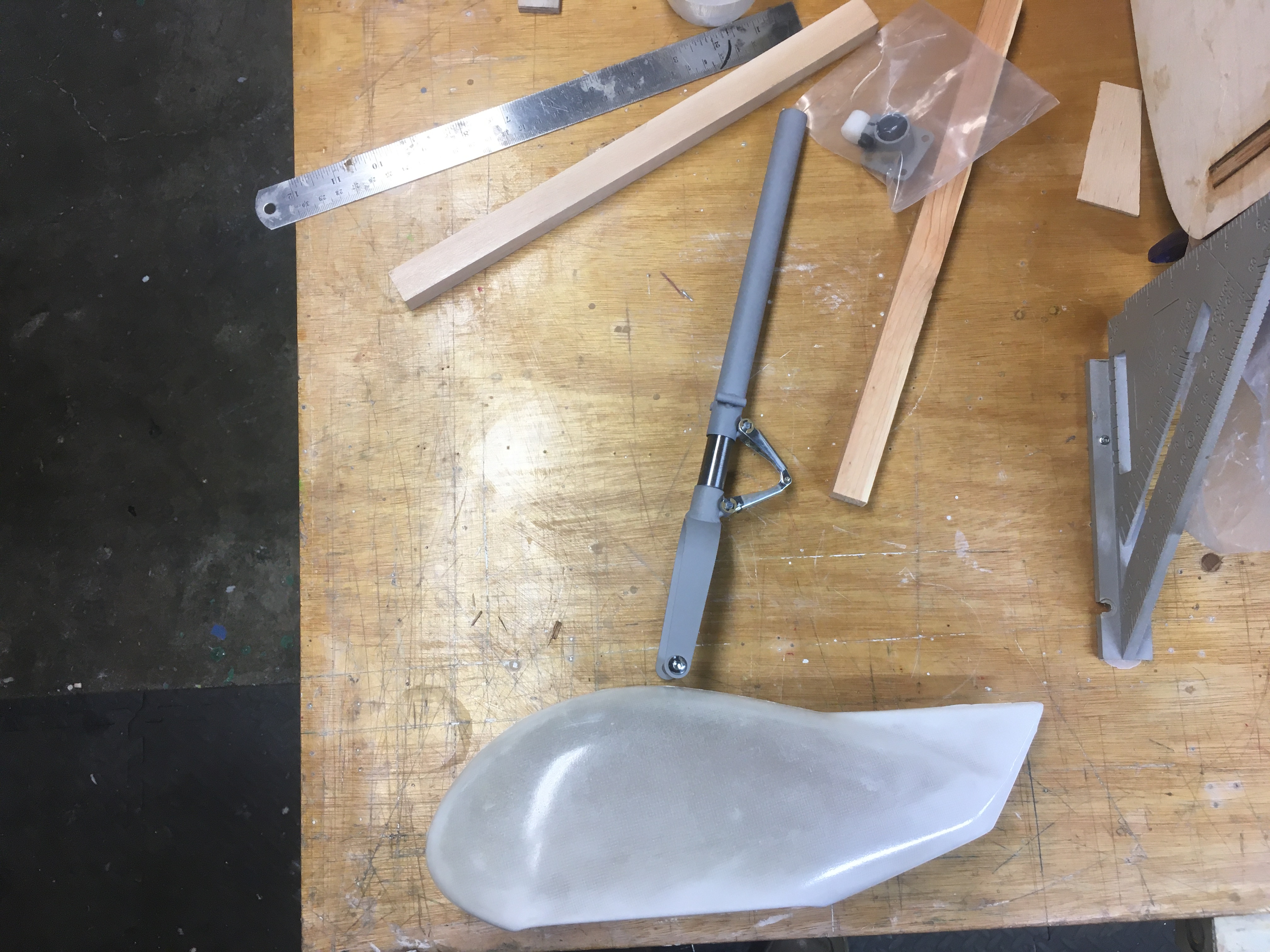 While waiting for glue to dry decided to have a look at the nose wheel which I will need before I close up the bottom. The plans show Sierra hardware but I bought Robarts. I had 1/2" Robostruts on the original Cherokee and they held up very well over the 7 years of flying. I didn't care for the steerable nose wheel shown and decided to order a fixed style fork strut for the nose and make my own bearing. I ordered 2" x2" UHMW Slippery Polyethylene bar from McMaster Carr. I will turn this into the bearing mount. I also need to replace the wheel yoke with a longer one, currently the torque arms end up inside the wheel pant, need about 1/2" more length. Not sure which way I will go, just scab pieces on the existing yoke or make a new yoke and weld in on. Everything is inside the pant so no one will see if I decide to scab it.