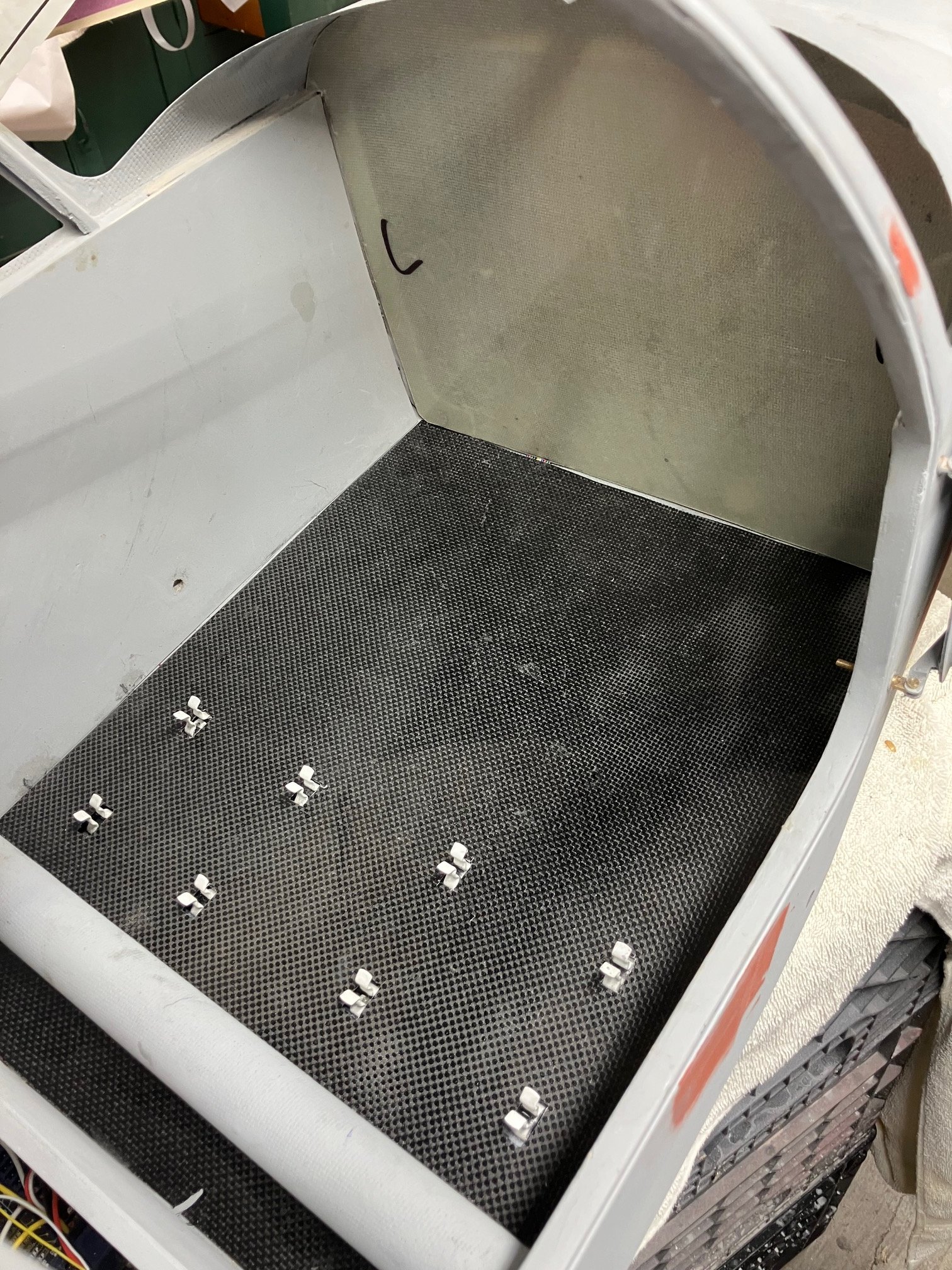 Laid up one layer of 1 1/2 ounce cloth and 1 layer of 5.7 ounce carbon on a sheet of glass under vacuum for for the subfloor. Thinking this will let covered with a gray vinyl or cloth. Need to see what is available at Walmart or Michaels. Cut and fit the baffle at F2, this will keep the hot air out of the cabin area. The baffle was a lay up done for the engine baffle but a little too light. It will get a coat of flat black. I used the .020" styrene sheet for the template for the the floor, works great, cuts easy with a knife.