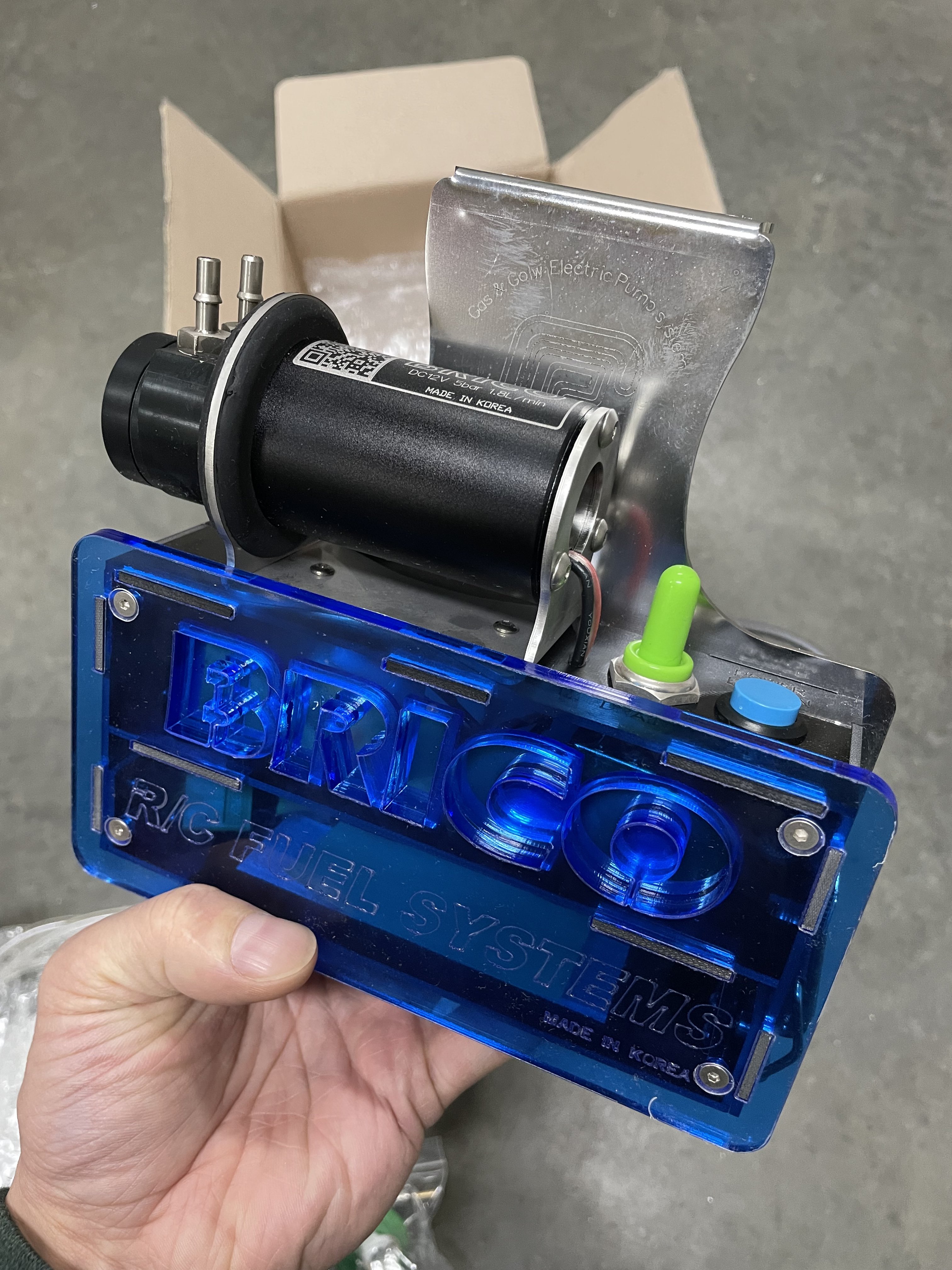 Finally bit the bullet and treated myself to an electric fuel pump after years of hand cranking with an MPI. Even though I bought a Grayson PQ12 pump to build something myself I never got around to doing it… I was getting some 20ga servo wire from Booma RC when I saw this Brico setup. Had to modify it a bit to accept my current jug, and though it became with everything for a new jug, I reused me secraft stuff. Took about 45sec to fill a 24oz tank with a push of a button. So cool.