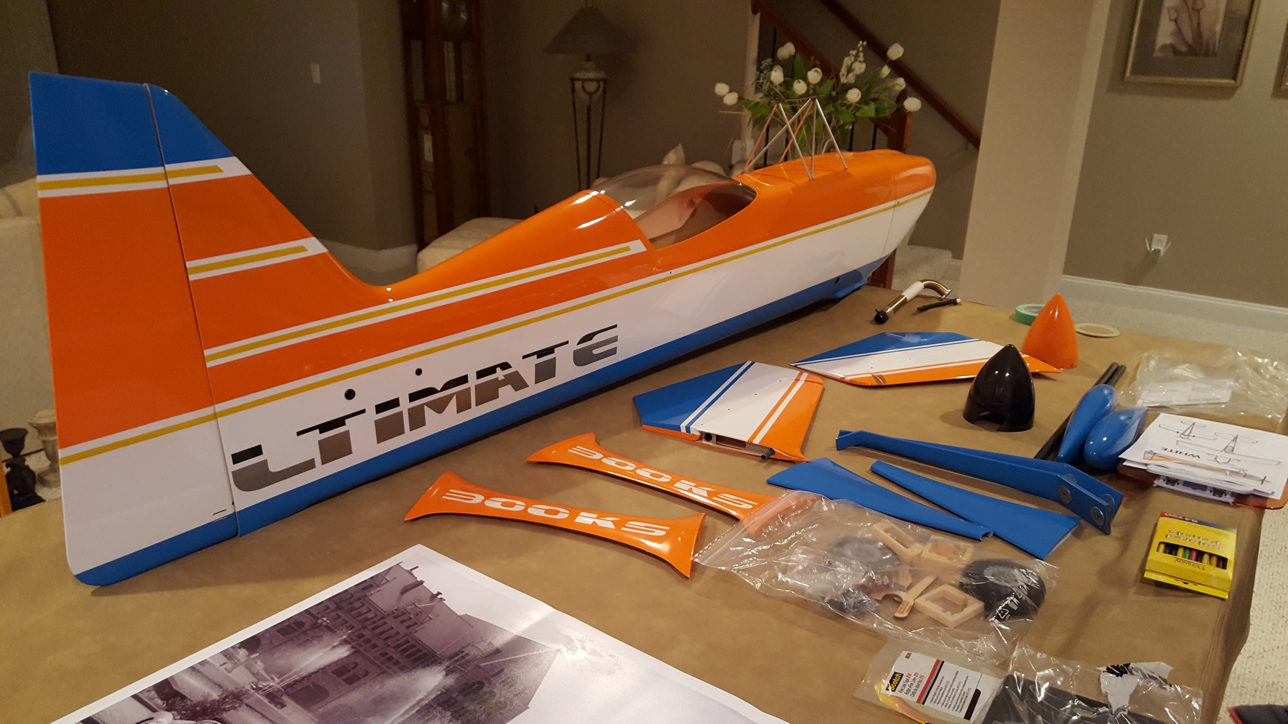 Wow!!!Not exactly brought by the postman, but new none the less. My buddy Tony's new Ultimate. He informed me tonight when I went to look at it that I'm building it. We're also repainting it to a different scheme. It will have a DA120 with cans, Hitec servos, PowerSafe reciever.